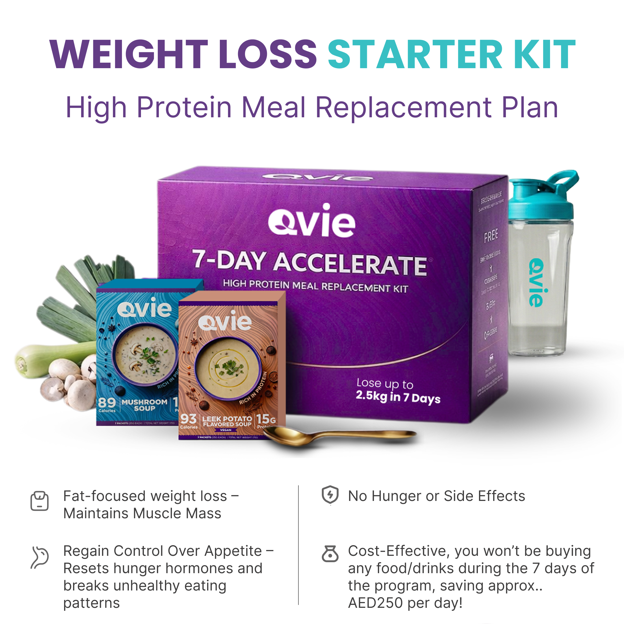 Qvie Accelerate is a simple, high-protein meal-replacement plan designed to deliver fast results in one week—no gym, no cooking, no calorie counting.